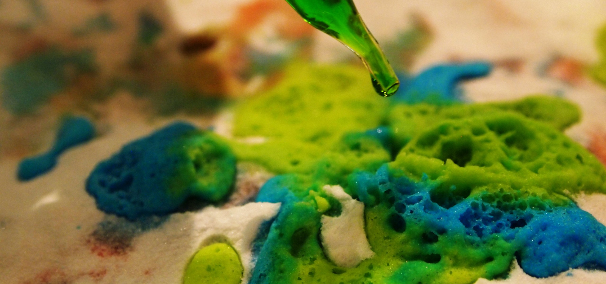3. Using the eye droppers, get some of the colored vinegar and squeeze anywhere on the baking soda. Then just watch the science happen!